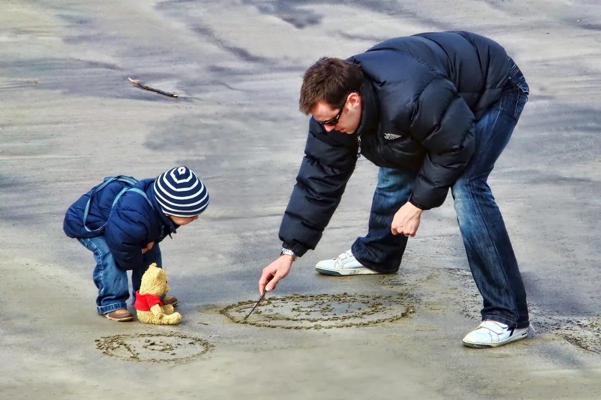 I came across this delightful scene at our local beach and loved how the little boy mimicked his father's stance and how he (along with his teddy) was so absorbed in the sand drawing :)