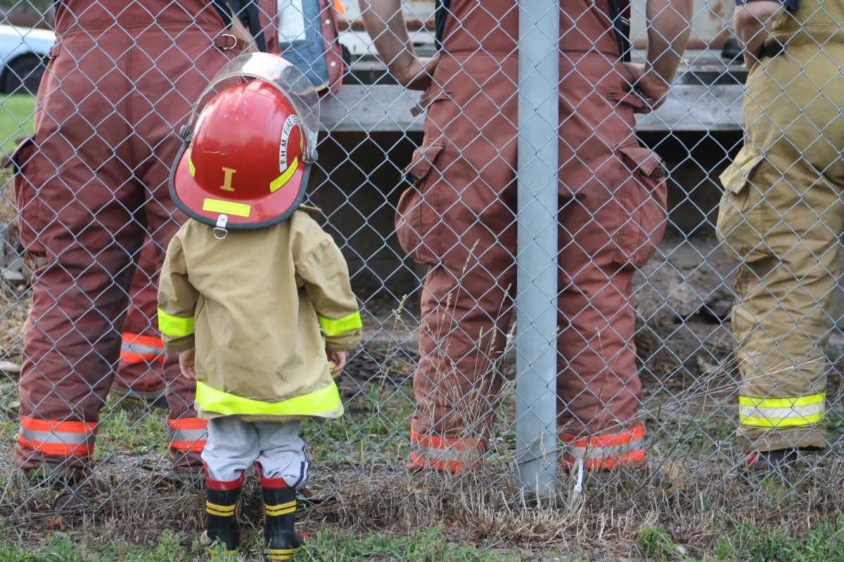 My two sons (ages 3 & 6) live and breath firefighting. They so admire and look up to their heroes in the fire service. Here is my 3-year-old "hanging" with the guys at fire training...he can't wait to be part of the action.