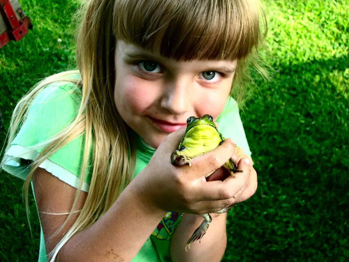 My daughter Maycie had been chasing frogs all afternoon on Memorial Day. She finally caught one at the end of the day and it was the brightest one around. This was taken at her grand dad's house, back by his pond.