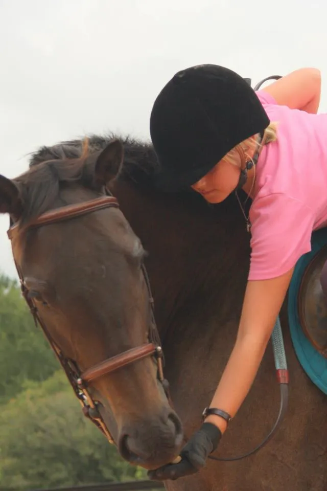 It portrays the love and trust between the two. At the horse barn during riding lessons. This picture warms the heart of anyone that sees it. True display of love and trust between horse and rider.