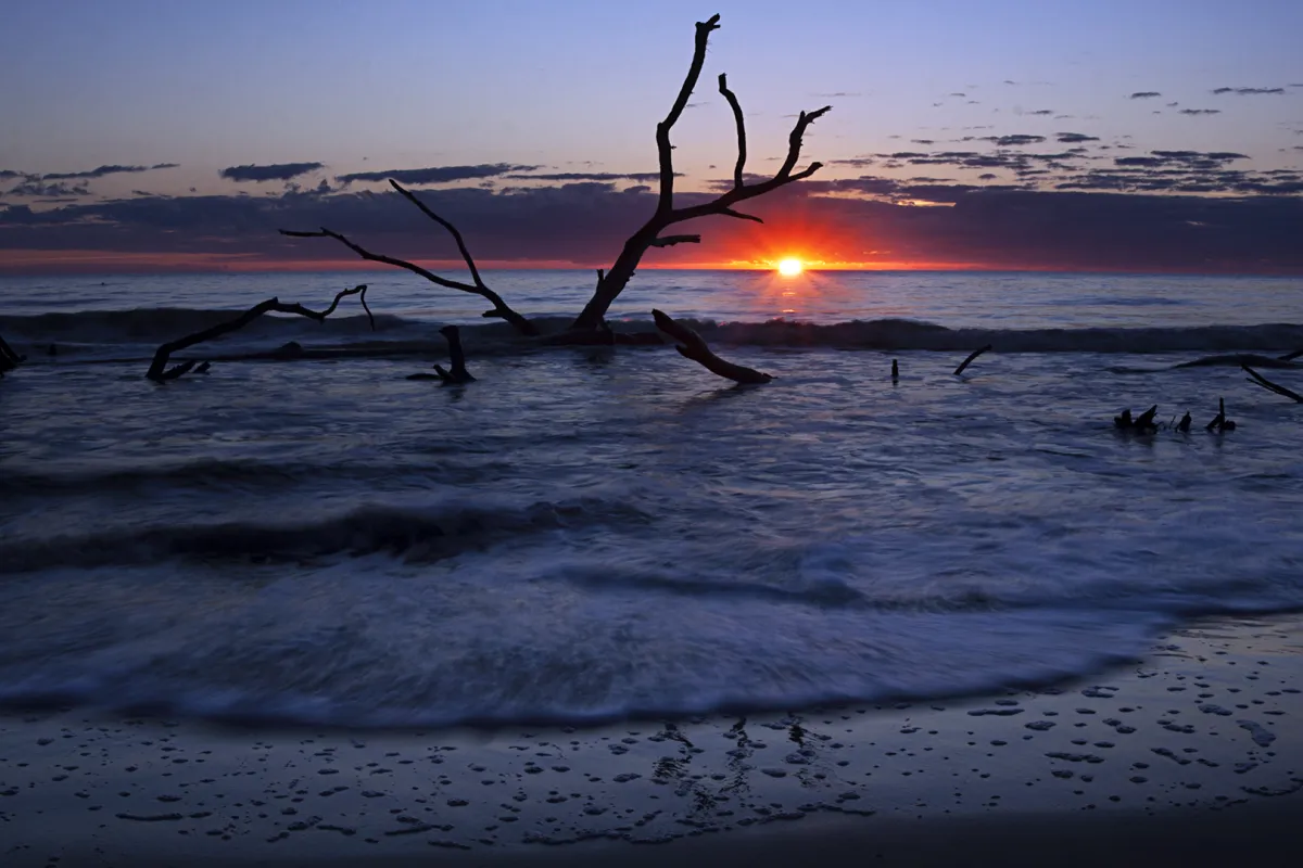 Sunrise over the Atlantic Ocean and the beaches of Hunting Island, South Carolina.