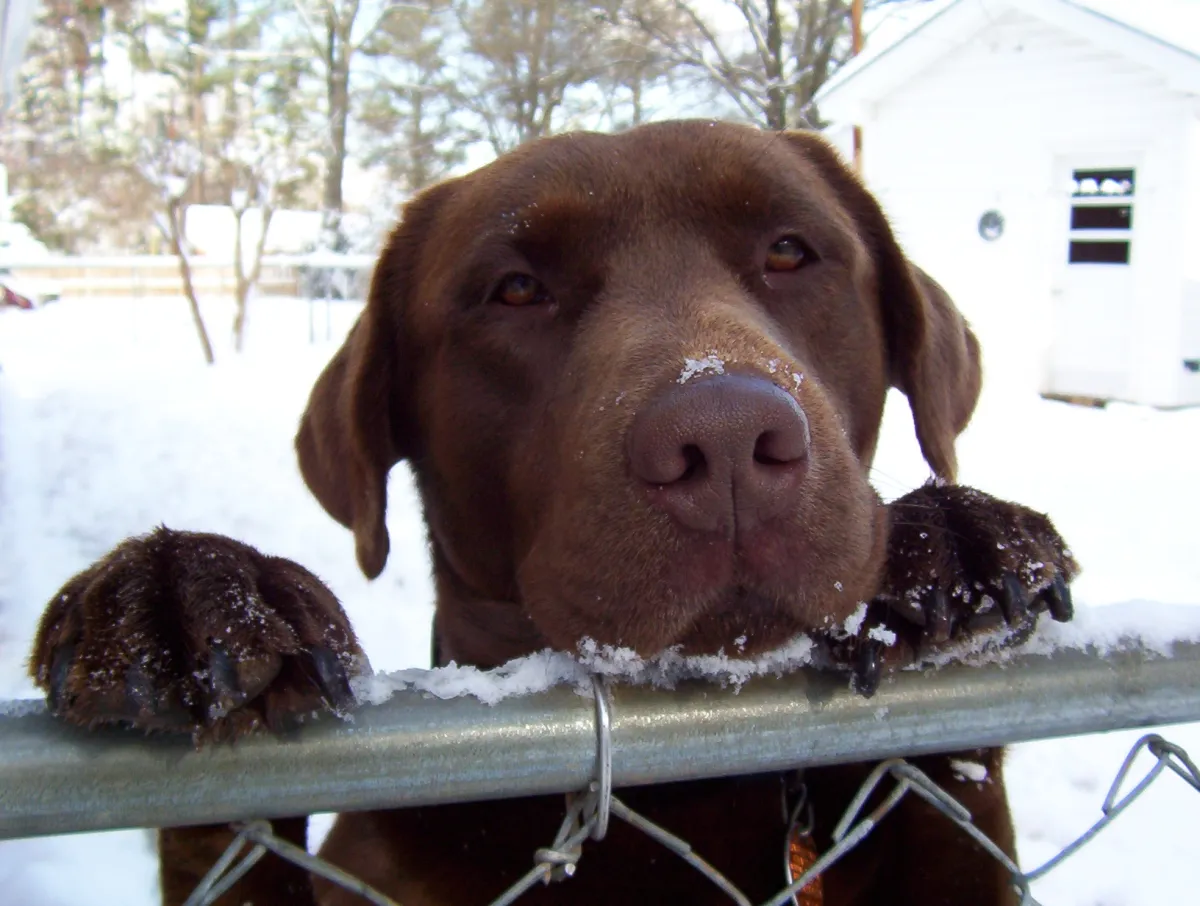 This is my Chocolate Labrador Retriever named Chance Clamp. The picture was taken in my backyard in Rock Hill, SC during a snowstorm in January. When I saw him posing that way, I just had to get a picture.