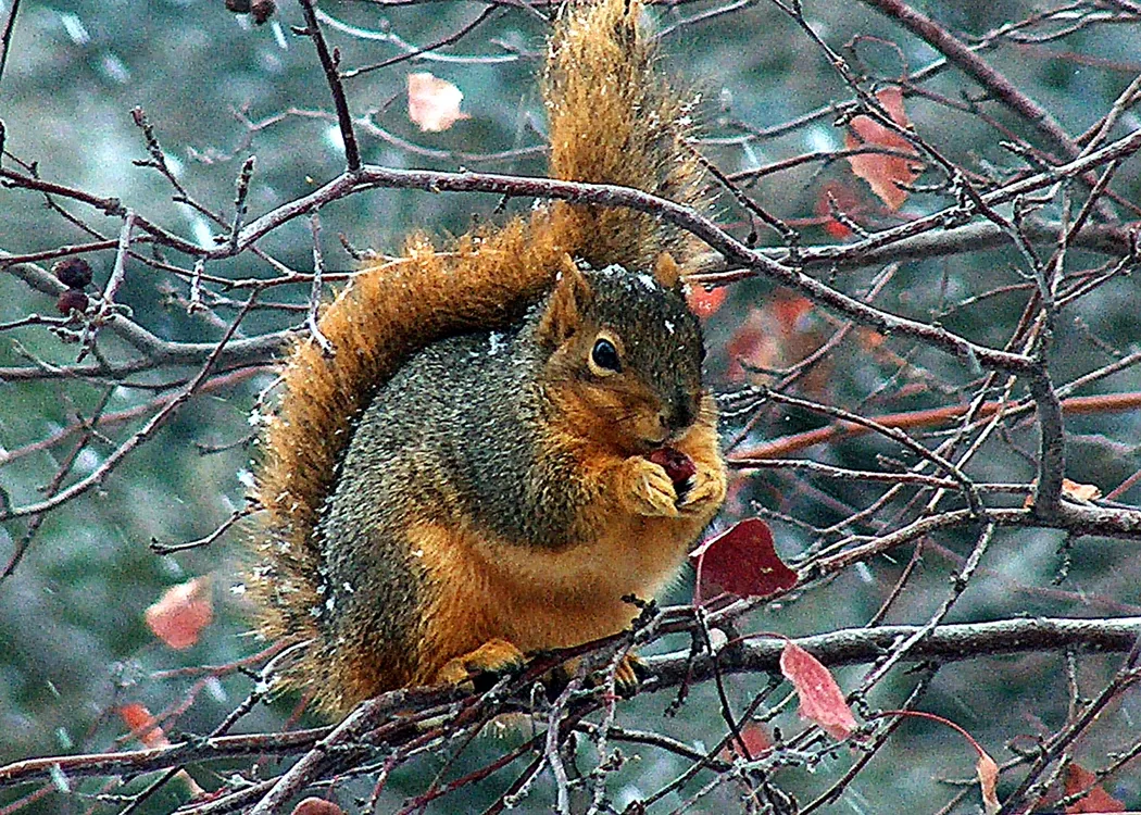 One snowy morning last November, I looked out the window to see a squirrel eating crab apples from our tree. His tail bushed up behind him was all that protected him from the windy cold.