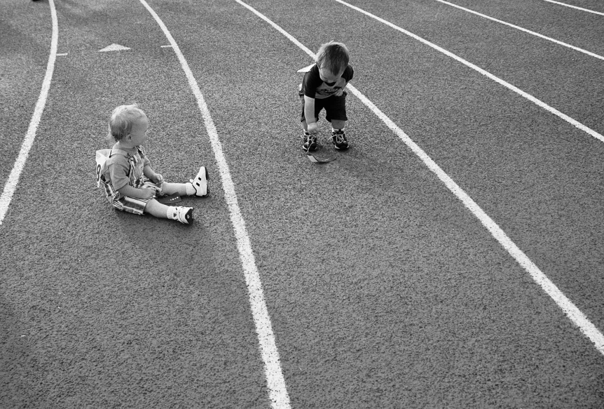 Do you ever wonder what would happen if you tried to hold a race with two year olds? Lets just say it can take longer than you would expect. This was taken in July 2004 at our local "Fun Run." My little boy and his buddy were "racing" in the two and under group. Everyone is a winner in this race.