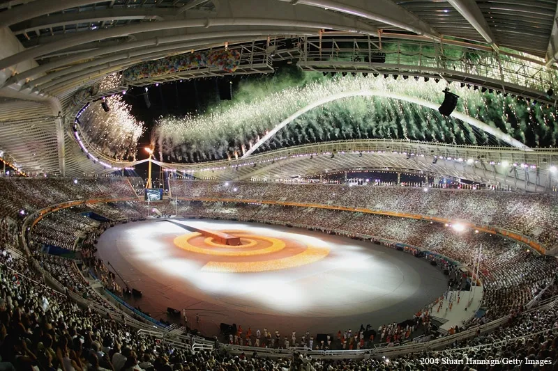 Fireworks light the sky during the Closing Ceremony of the Athens 2004 Summer Olympic Games. The President of the Athens Organizing Committee said; "Tonight, the Olympic Flame will cease to burn in Athens, but will continue to warm our hearts." Thank you Athens! Thank you Greece!
