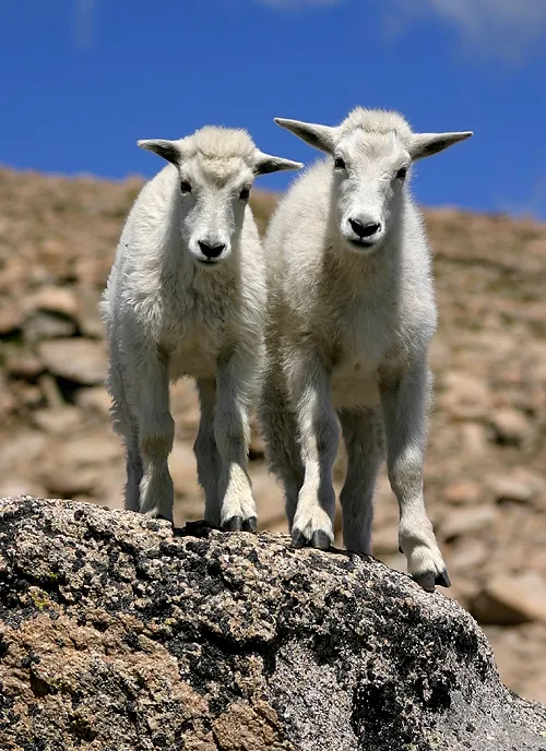 I was setting up my camera and tripod to photograph the father of these two kids. I looked over my shoulder and was surprised to see these youngsters wrestling for position on a rock so they could see what I was doing. This image was captured on August 8, 2004. At nearly 14,000 feet elevation, it was a beautiful day on Mt. Evans in Colorado. The mountain goats are very gentle creatures.