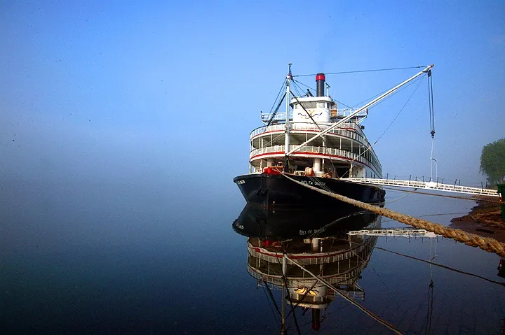 I was pleased with the final result of this picture because of the contrast and glass like water. It was taken on the banks of the Ohio River in Marietta, Ohio early one foggy morning. The boat is the Delta Queen, a leisure boat for vacationing on the Ohio River.