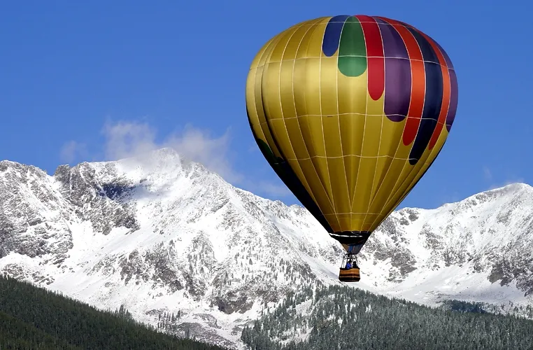 Drifting along in silence amongst the peaks of the Colorado Rockies. Fresh snow on the mountains and a clear blue sky provide a great view for the balloonists in the gondola. This image was captured near Breckenridge, Colorado on October 2, 2004. A thrilling ride in one of the most scenic places in the world.