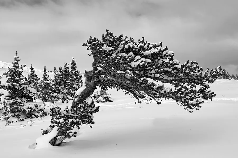 This Bristlecone Pine may be 1500 years old. It is located near the continental divide at 12,000 feet elevation. It is the lone survivor of a long ago forest fire. This image was captured on November 30, 2004 above Hoosier Pass. It was a 90 minute snowshoe hike to reach the mountain ridge. This tree represents the resiliency of growing plants to withstand the harsh environmental conditions in the mountains.