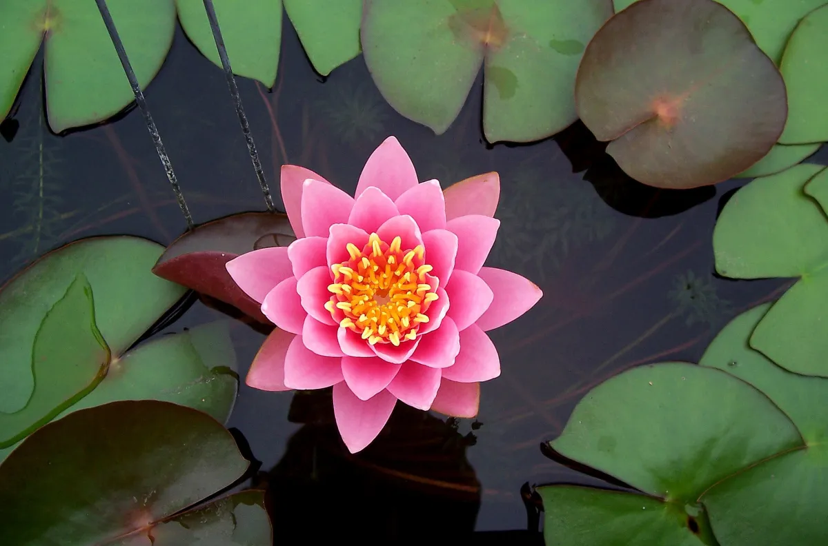 Water drops on nylon netting reflecting a gerbera daisy in the background. The water was placed on the netting with an eye dropper and took a while to get in place.