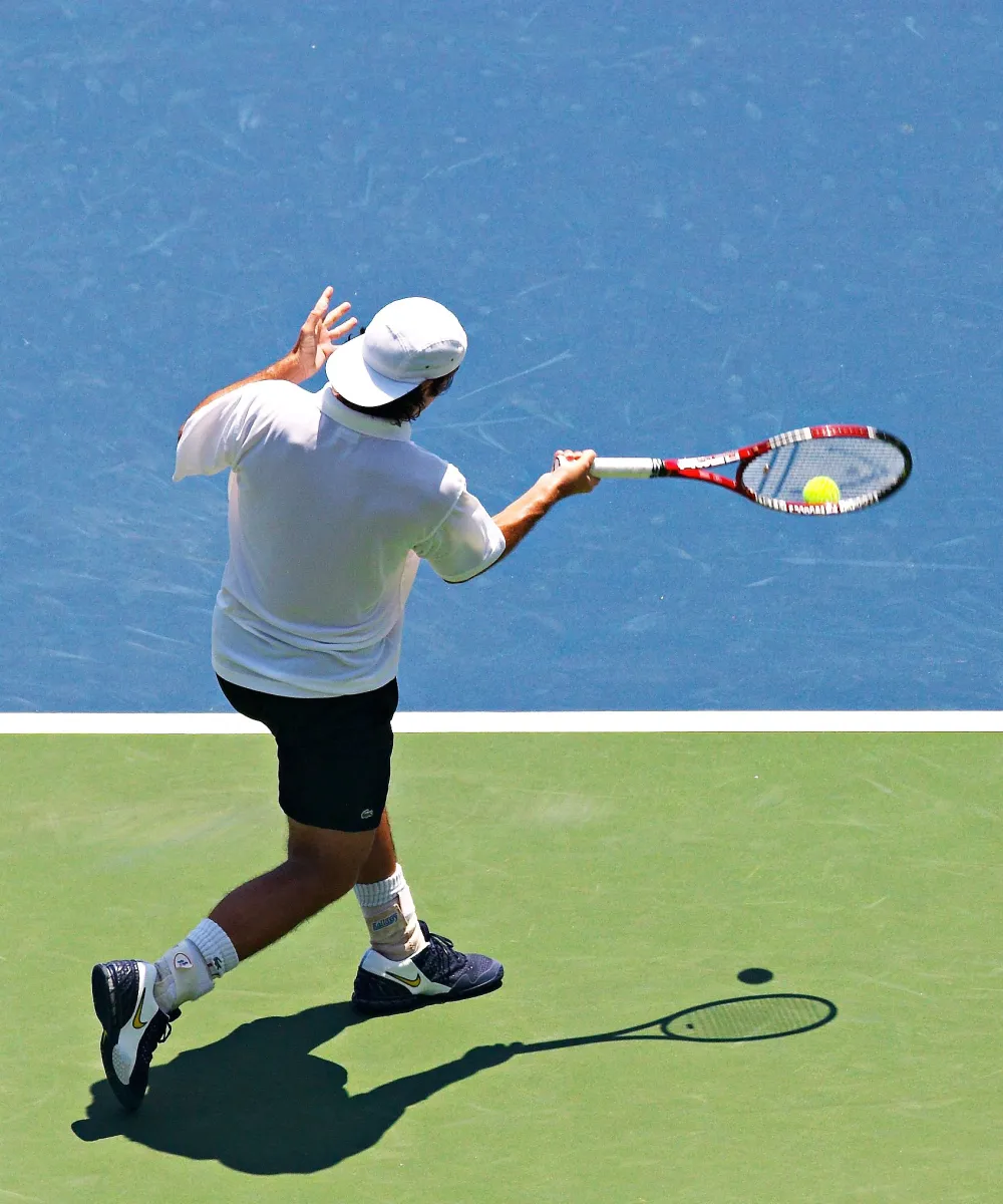 I love the interplay of the tennis player's position, the ball's position, the shadow, the colors and the line. The picture was taken at the 2005 Mercedes-Benz Cup.