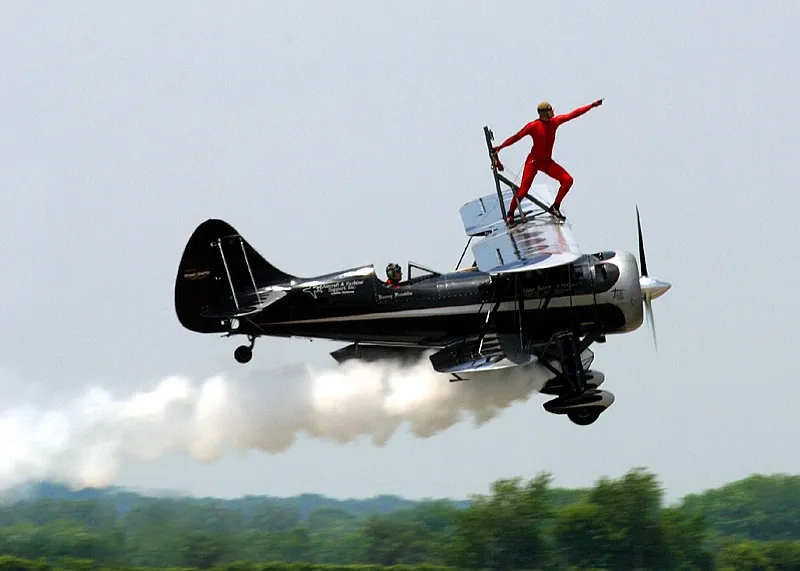 Kyle Franklin strikes the Mercury Pose while wing walking atop the Jet Waco, a jet assisted biplane piloted by his father Jimmy. Tragically, Jimmy was killed a month after this photo was taken when his plane collided with Bobby Younkin's at the Moose Jaw, Saskatchewan Air Show.