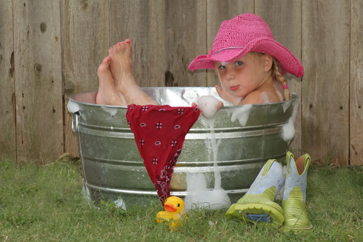 This is a picture of my two year old little girl, taken in my backyard in Texas, June 2006. She is taking a cowgirl bath!