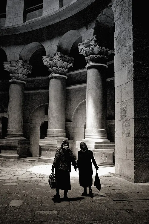 The two old women are lit by the ray of light coming from the top of the church.