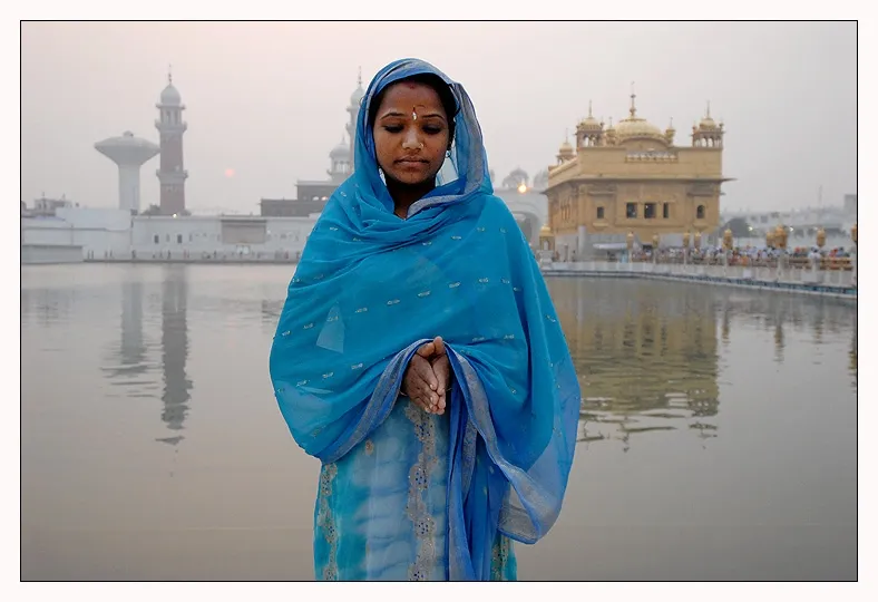 It is dawn at the Golden Temple, at Armistar, India. A delicate "blue flower" is immersed in a prayer. I like her stance, her concentration and the way the early morning light provides a subtle contrast to the light blue cloth.