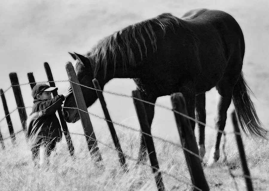 My son and I were spending the day together taking some pictures along a back road in the direction of Sequoia Nat'l Forest, when we came upon a small ranch with horses... When we approached the horses, he startled all but one and this horse came right up to him and allowed him to pet him. I took a few pictures hoping to capture the special moment.