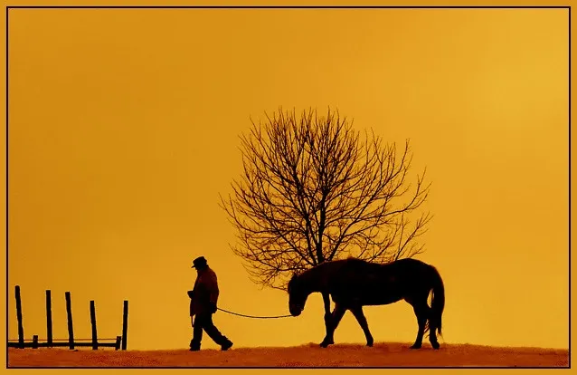 In this picture the man and the horse look worn out after a long day. I like how they both have heads hanging down. It's very peaceful.