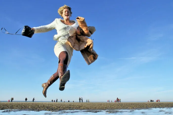 She jumped for joy.. on the beach.. on a sunny Sunday..