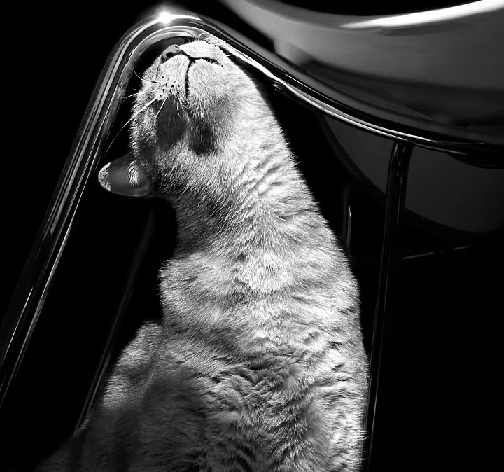 I took this photo of my daughter's cat, Micio, enjoying the feel of the smooth chrome legs of her dining room chair. I loved the way the window light brought out the design elements of the shot.