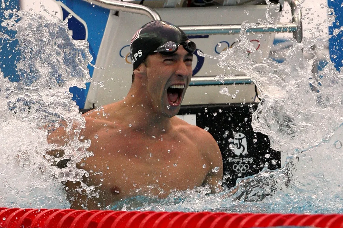 Michael Phelps of the United States celebrates victory in the Men's 100m Butterfly Final held at the National Aquatics Centre during Day 8 of the Beijing 2008 Olympic Games, August 16, 2008 in Beijing, China. By winning gold in the Men's 100m Butterfly, Phelps tied Mark Spitz's record of winning seven gold medals in a single Olympic Games.