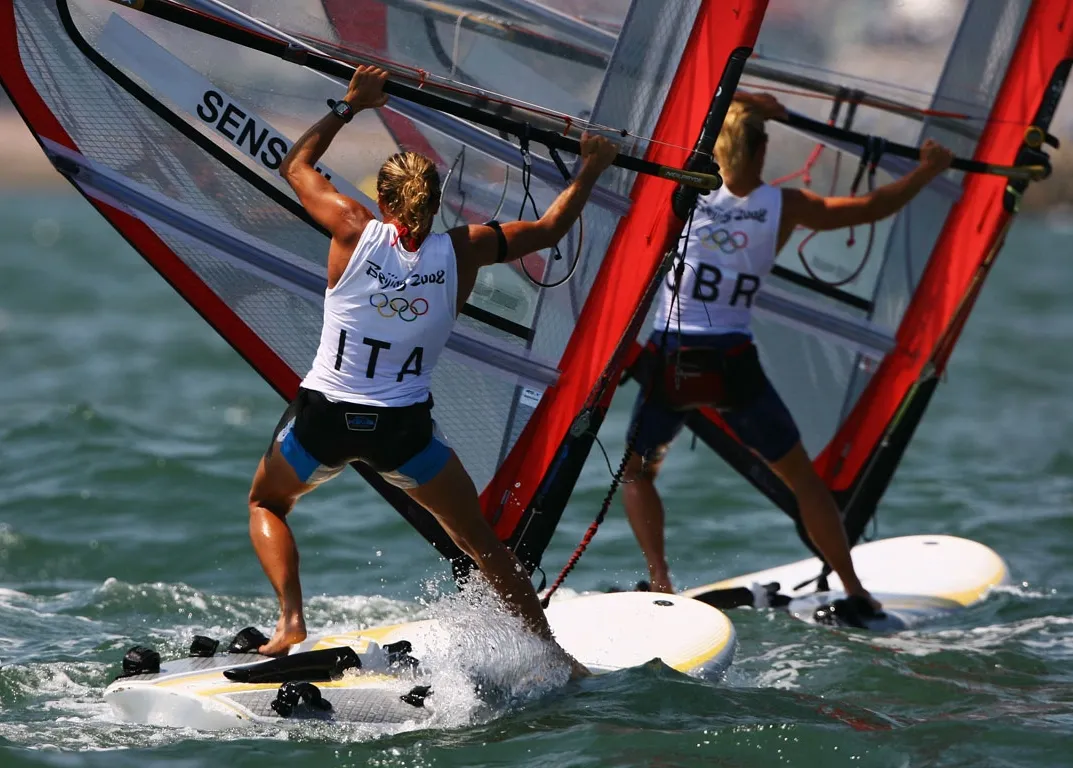 QINGDAO, CHINA - Alessandra Sensini (left) of Italy and Bryony Shaw (right) of Great Britain compete in the Women's RS:X class medal race held at the Qingdao Olympic Sailing Center during Day 12 of the Beijing 2008 Olympic Games, August 20, 2008 in Qingdao, China.