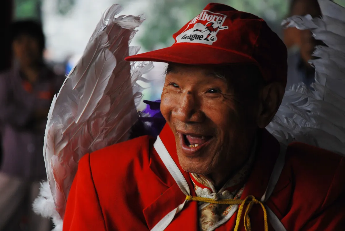 I saw this old guy wearing mismatched clothes and angel wings, dancing in the park outside the Temple of Heaven in Beijing. He seemed to be in his own world, but his infectious smile spread to the whole crowd around him. Who says angels wear white robes and have halos?