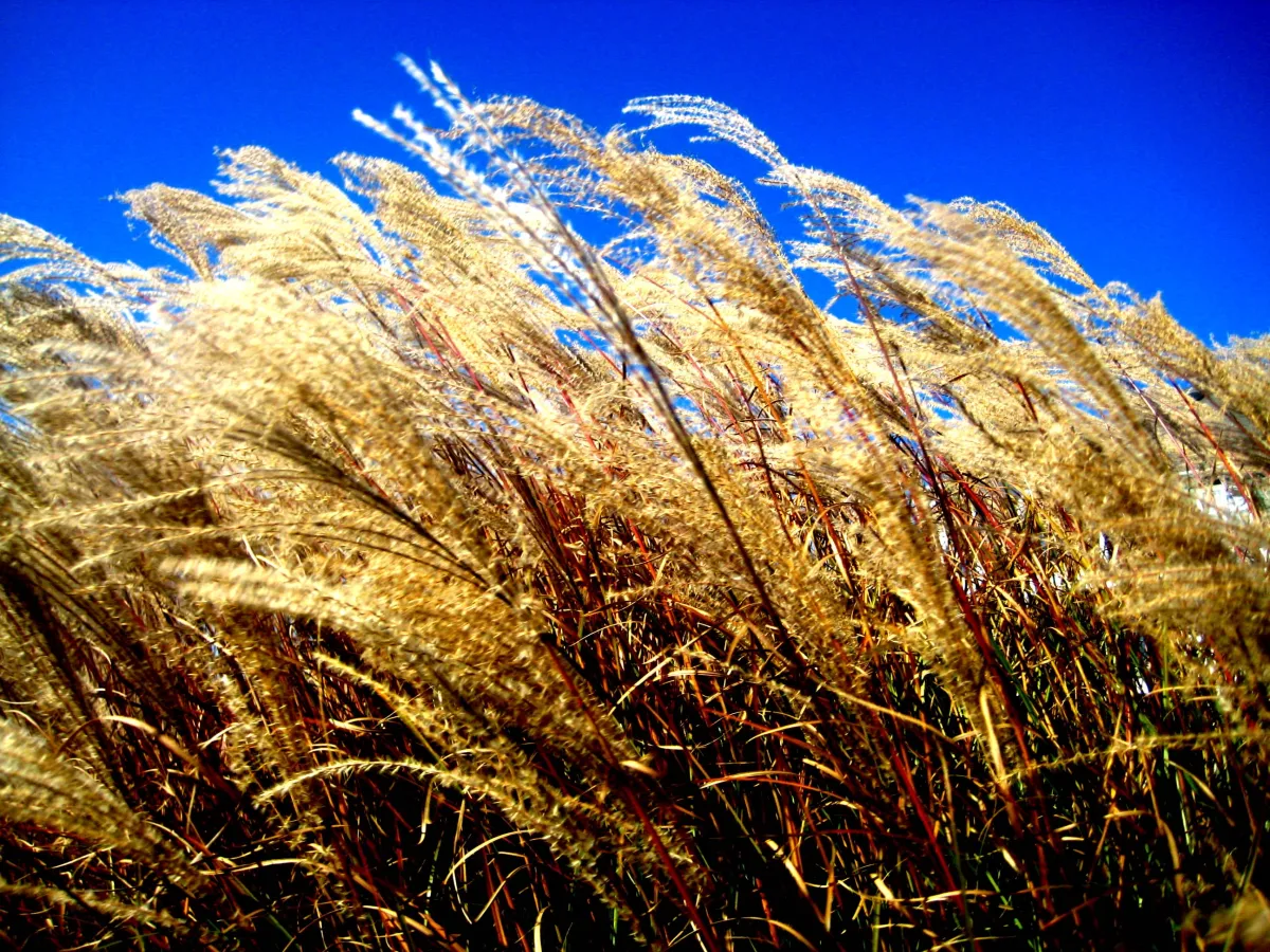 I took this in November 2008. I was walking around the lake in my neighborhood. I like the intensity of the blue and how the wind is blowing the plant.