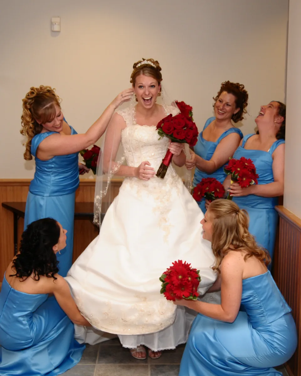 This is a photo of my daughter, Lisa, right before her wedding ceremony in May. While fluffing her dress, one of her bridesmaids reached up and pinched her bottom!
