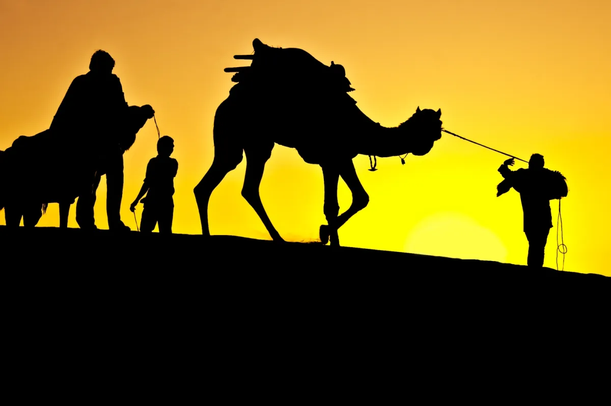 I shot this silhouette at Khuri sand dunes, Jaisalmer, Rajasthan, India during desert festival in Feb,09. I liked the the way the camels owners were taking back their camels in the evening.