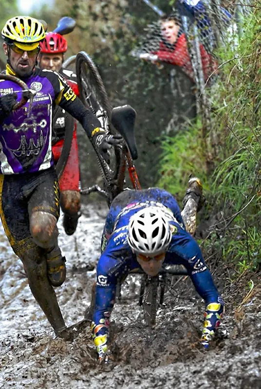 I took this some time back in Connecticut. The story goes like this. These are die hard athletes and nothing stops them. It had rained for hours but was expected to be a nice day, so the race was on. The one in the blue thought he knew everything and tried to ride his bike through the mud. All the others knew enough to carry their bikes through it. But - check out the spectator on the top right. He got it too - the fence caved in from the crowd pushing to see what happened - and down went the guy in red.