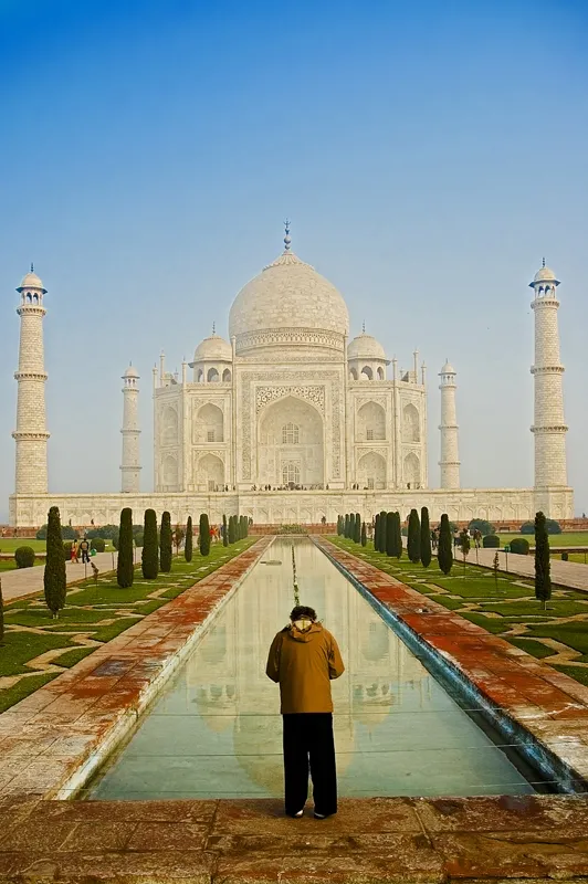 I saw a photographer standing exactly in the centre and trying to capture the reflections of this White Beauty. I liked the symmetry of the frame. I captured this in 2009 during my trip to Taj Mahal, Agra, India.