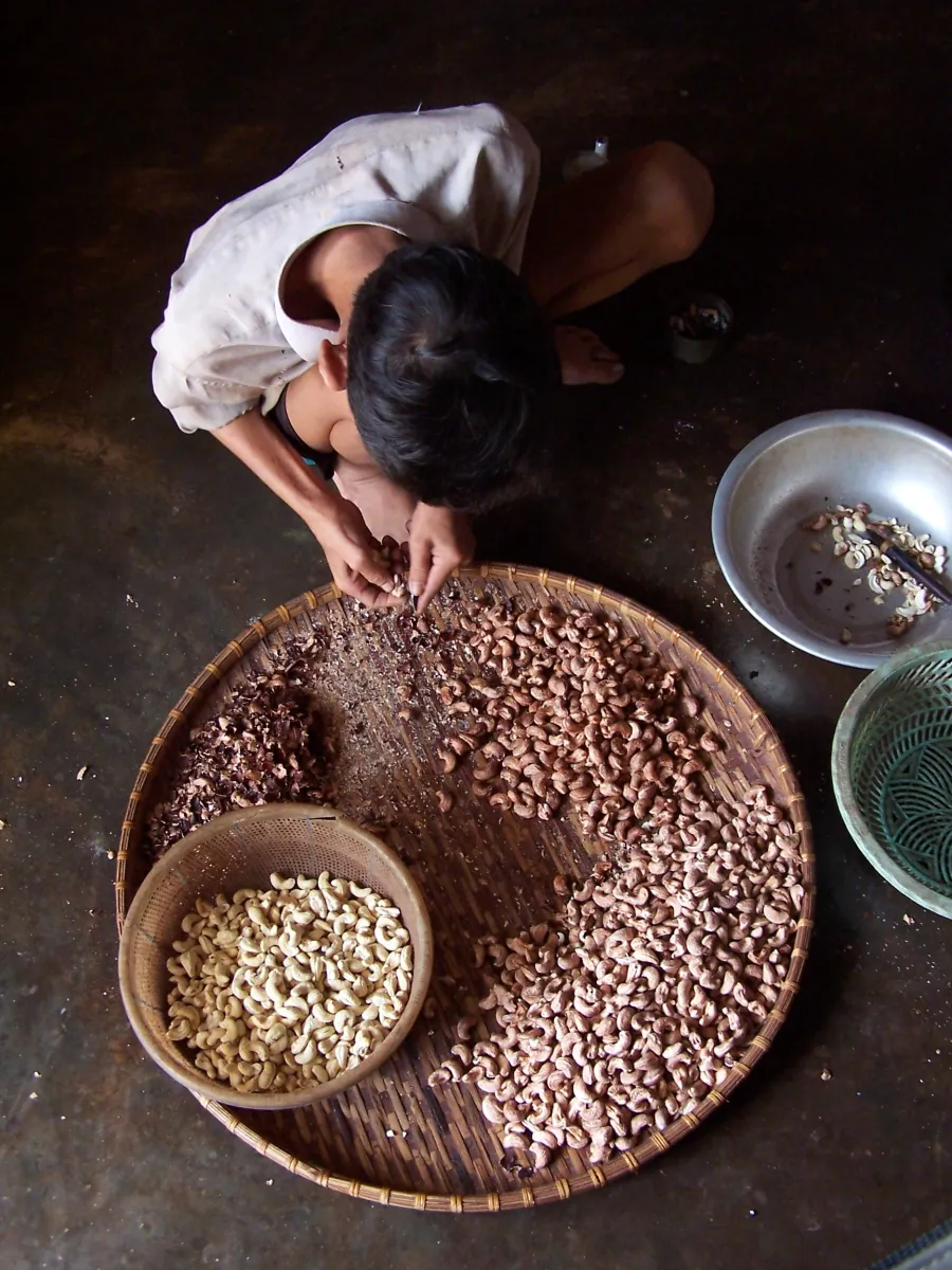 While traveling through Vietnam, I visited a number of homes. This gentleman was laboring over a pile of Cashews. He was using an Exacto knife blade to scrape the skins of of the nut. Later, he will turn it for a profit of $1 USD per Kilo.