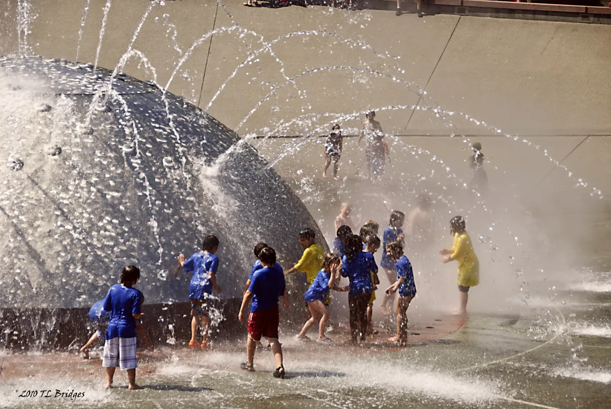 The Seattle Center is a magnet for people of all ages all summer long. The fountain sprays water all day and kids flock to it like bees to flowers. Here they are playing in the spray in the afternoon sun.