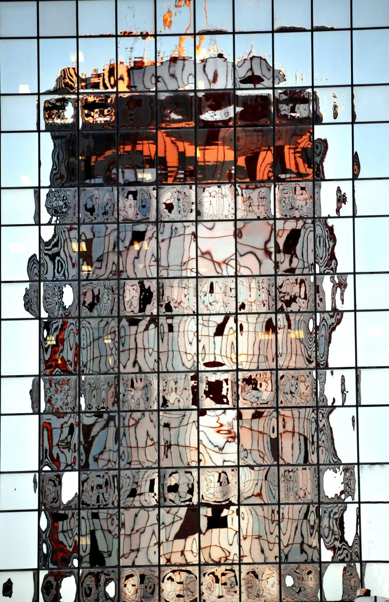 This image shows recursive reflections between two buildings (one flat, one circular) covered with glass. Taken in downtown Atlanta, the image looks unreal - but I have not edited it.