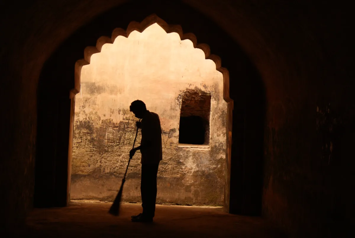 This photo was taken on a visit to Talaltal Ghar in Sibsagar, Assam, India. The caretaker was going through his daily job, not even bothered by what we were doing.