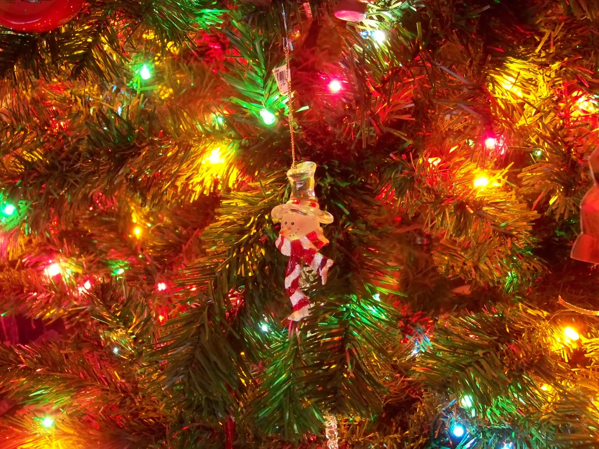 The snowman fits right in with the greenery on the tree. It was taken this year on my Christmas tree with just the tree lights on.