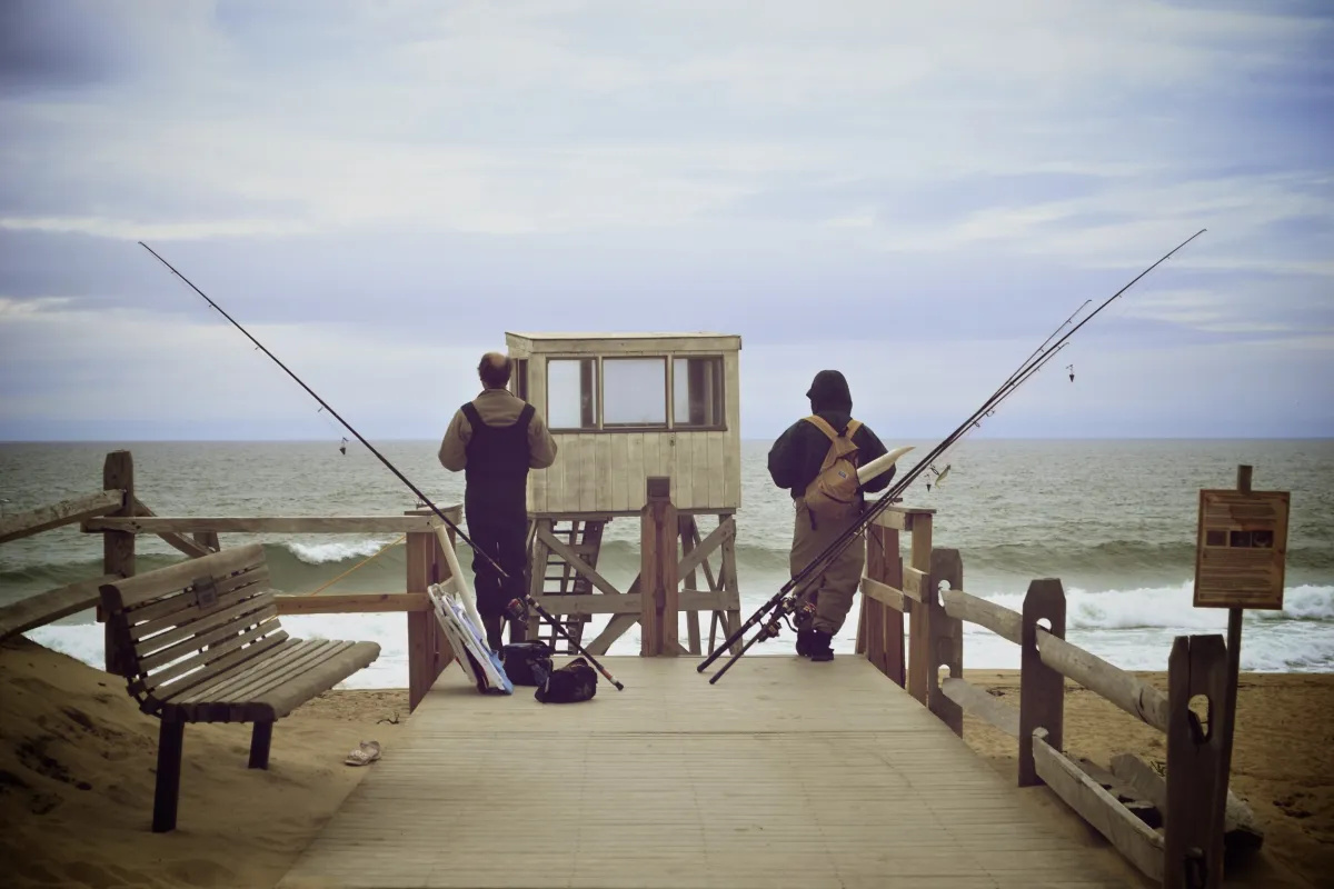 This picture was taken on Nauset Beach in Cape Cod, Massachusetts. It is interesting because the fishermen are looking out into the ocean after a long day of work. The symmetry of the men and their fishing rods is also special
