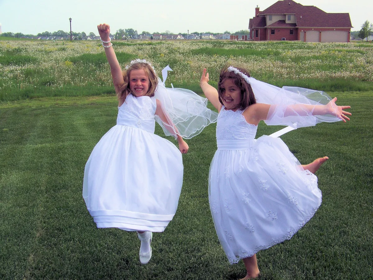 cousins who made their first communion one day apart. My grandaughter Isabella and my great-niece Angelina jumping for joy and looking like little angels at the first communion party. taken 5-22-11 in Newport, Mi.