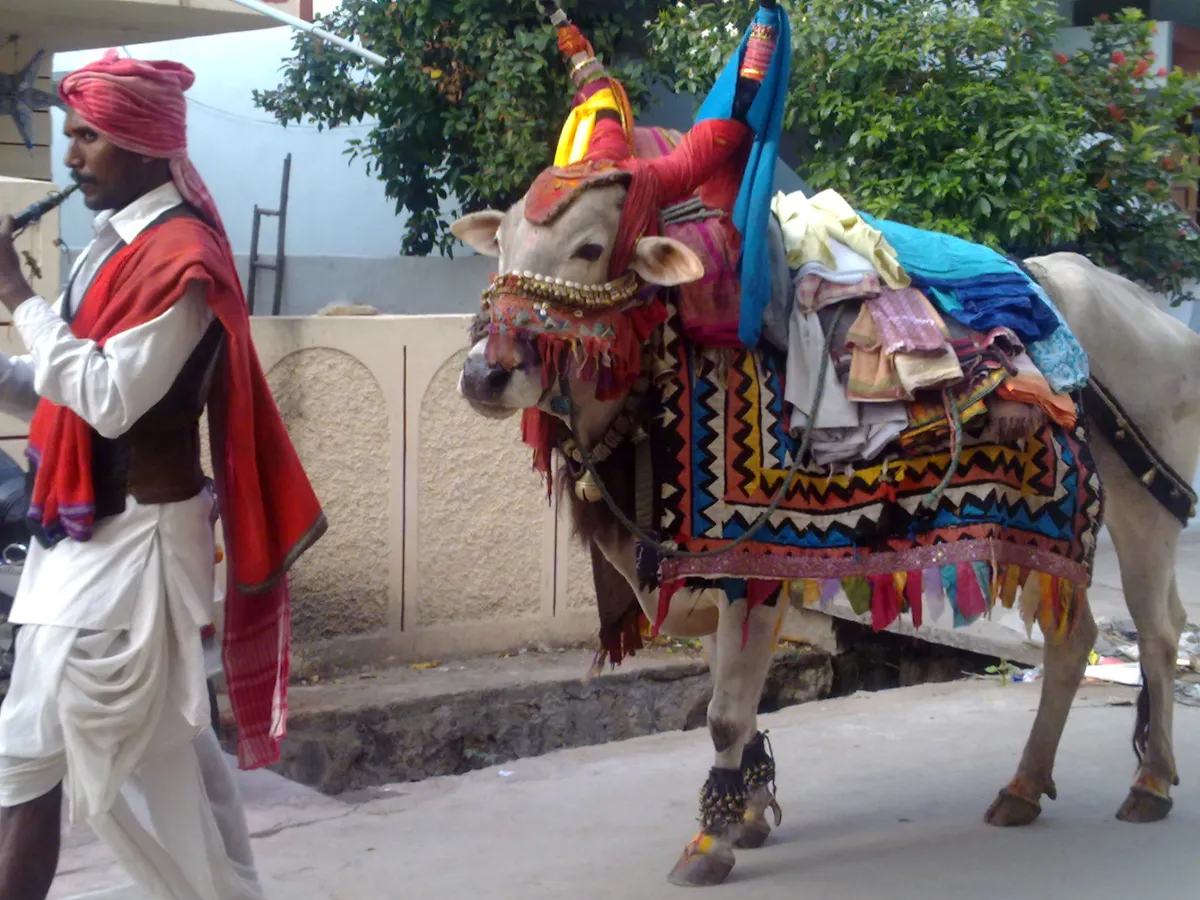 A cow is believed to be very sacred by Hindus around the world, specially Indians. A cow is really very useful in all forms. We get Milk from Cow, Some eat its meat, Even its cowdung is useful(It works as fire wood & also some people use it to decorate their house entrance followed by rangoli) Keeping all this aside, people decorate the cow & take it house to house to make their living.