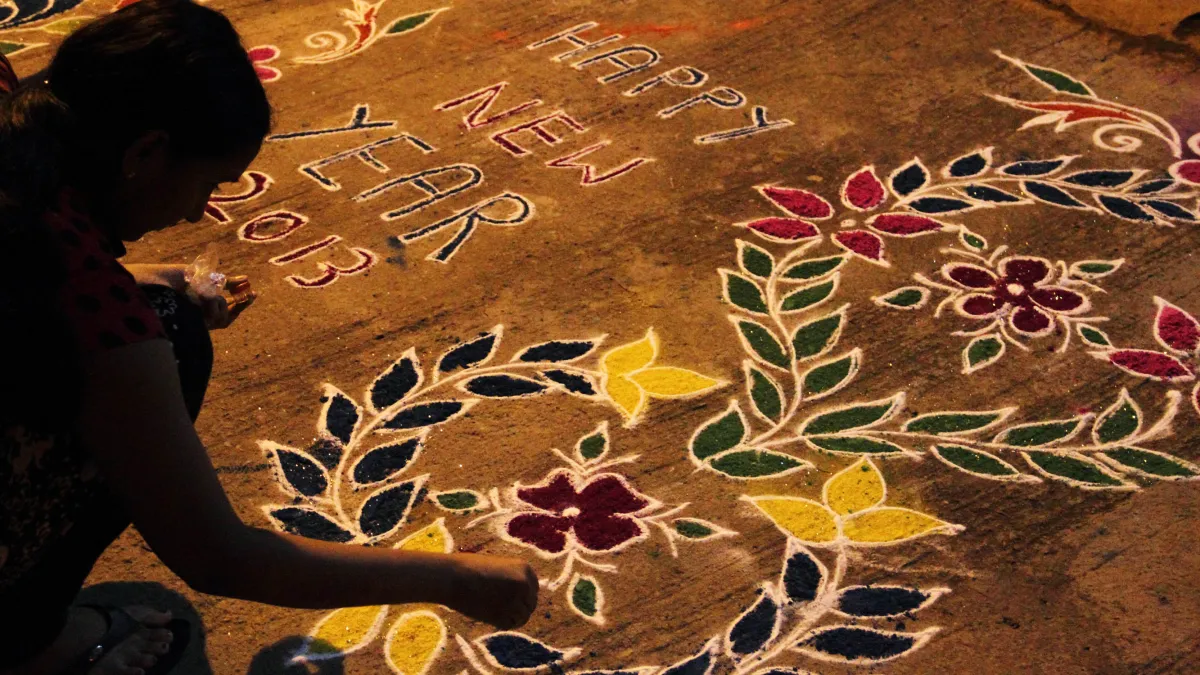Through pinched fingers, a stream of colored chalk powder flows uninhibitedly to leave a wonderful mosaic of flowers, leaves, birds and abstract designs. In South India, Muggulu (as its known in Andhra Pradesh in India) is a treasured art form passed on among women from generation to generation. This festive motif deftly drawn on the street at Hyderabad seemed to me the perfect way to herald 2013.