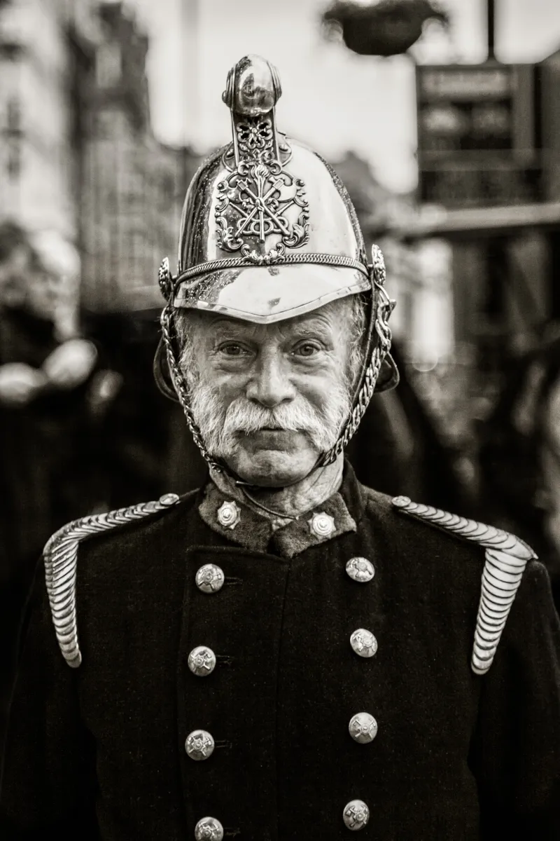 I took this shot at the 2013 St Patrick's Day parade in London, just as I was crossing a road the gentleman in the picture was walking towards me. As I raised my camera he paused and subtly stood up straight for barely half a second to let me get the shot, then gave me a smile as we passed one-another. A true gentleman and typical of the charming little experiences you get from street photography.