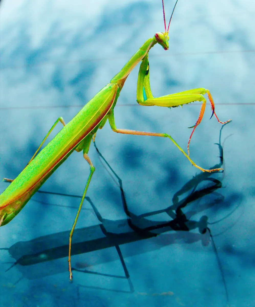 While walking out the door with my husband and our dogs, I spotted this praying mantis on my neighbor's car. I felt lucky that I am comfortable enough with my neighbor to immediately begin leaning all over her car to take my photos! I liked the way the clouds showed up in the window and the way that the sun and its reflections bounced off the bug and made him glow. He truly is a wondrous creation of God's!