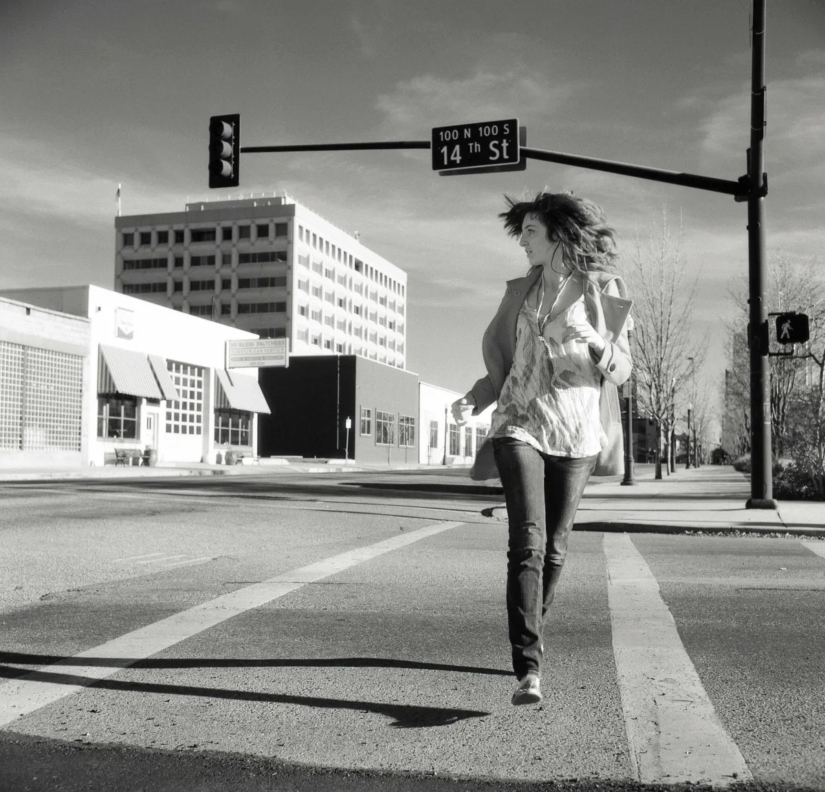 My friend Amanda trots across a quiet 14th Street in downtown Boise, Idaho (USA)