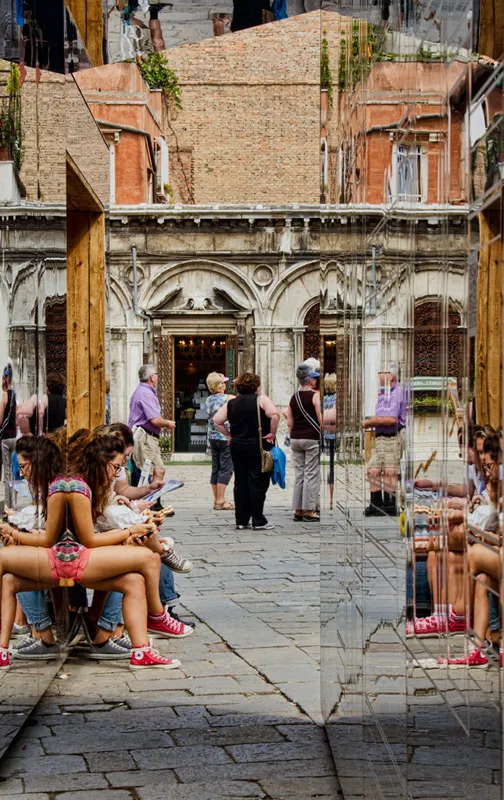I shot this photo in Venice this past summer. This time, we were in Venice for only a day, since we were gpoing to be embarking on a Mediterranean cruise from there the following day. On previous visits to this most most magical and photogenic of cities, we have been fortunate enough to have been able to stay somewhat longer. We came across this cultural art installation and the reflections it created by chance--and I loved it.