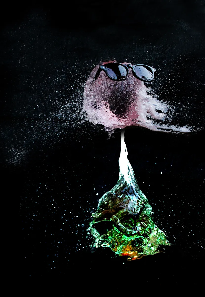 I was inspired by Scott Dickson and high speed photography and I captured the very moment when the needle pops the balloon filled with water. I took it at the start of March,2014 in my backyard using black bed sheets as background. It is artistic and creative because it's not just a normal water balloon, by adding props such as sunglasses or hats we get more action inside a frame.