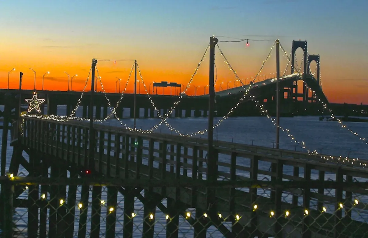 A lovely private light display on a pier facing the bridge; is makes the season bright especially as one crosses the bridge coming into town.