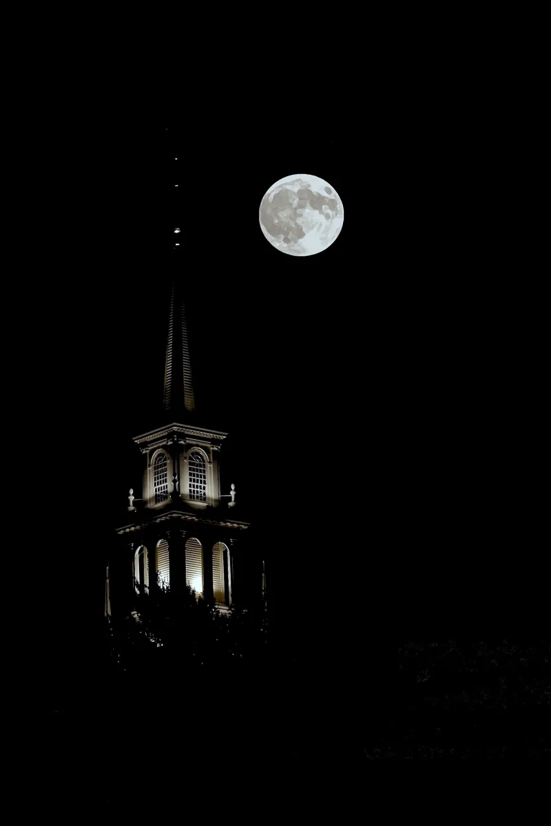 The church steeple's lights vs. the beautiful light of the full moon make for a lovely 'competition' of forms and light.