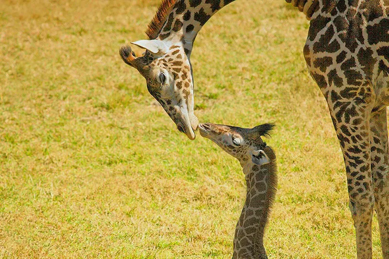 For the first time in history of the Brevard Zoo located in Melbourne, Florida two giraffes were born in the same month. This 10 day old baby is being tended and loved on one of her first outings joining the herd.