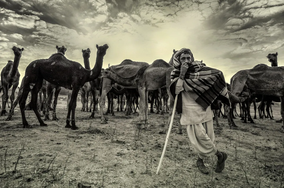 This is taken in the Pushkar fair ground in Rajasthan, India. Pushkar is famous for its rich cultural heritage and an excellent opportunity for photograhy. If you came to visit India you must come to Rajasthan. It is a grand place to capture the people of various strata of life. It was my first ever visit to Pushkar. Pushkar fair is the largest camel fair in the world. I love here the selling of animals and this man is standing all the night to guard the herd of camels in the vast fair ground.