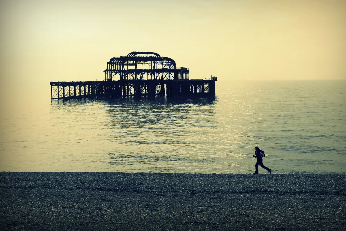 This pictures shows a man on the background of burned West Pier in Brighton, England. I shoot a picture during one of my trip around English Coast. Despite the fact that it has very famous burned West Pier on background, you can see the man on the first plan, all together make a very specific scenery and that's why this pic is so unique.
